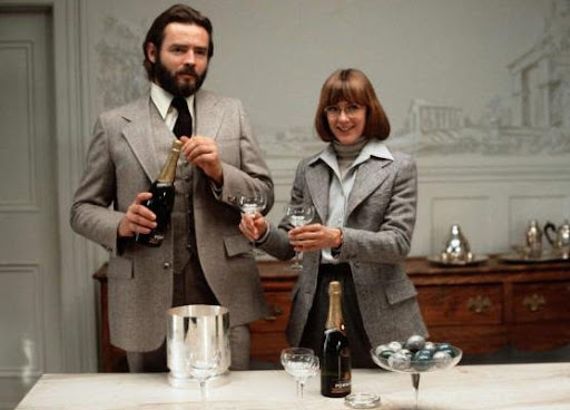 The dining room from "Interiors" - notice the gray mural over the wainscoting. Large antique English buffet with silver accessories. Woody Allen's films typically are filled with interesting houses and sets.
