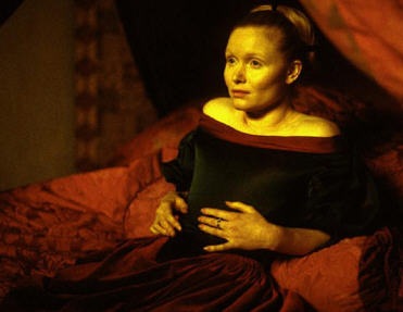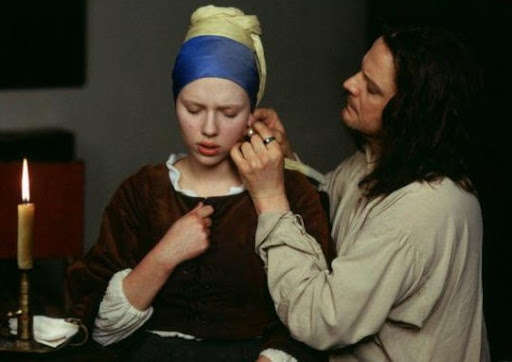 Scarlett gets the pearl earring for the first time from Vermeer. The blue of the scarf stands out from the movie's muted tones.