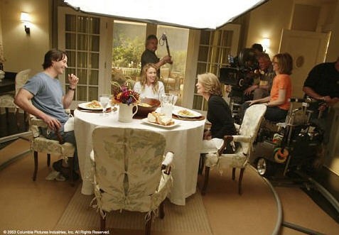 Here's how the dining room looked while being filmed. Notice how the seagrass rug fits only under the chair! The table is on a dolley that turns the set around. Director Nancy Meyers is on the right in an orange t-shirt.