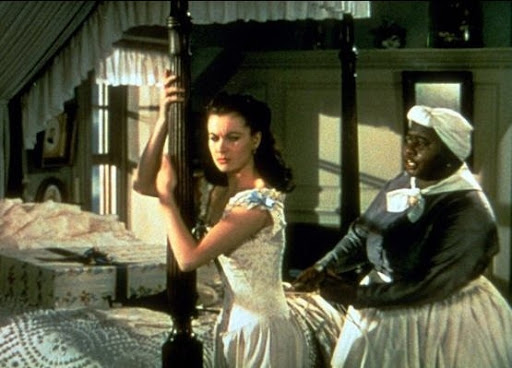 Mammie laces up Scarlett's waist as she leans on her rice bed with its colonial style bedspread.